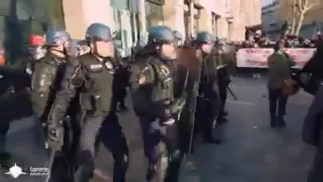 Участники митинга в Париже принялись атаковать кордоны полиции. На кадрах опубликованного в Twitter видео граждане нападают на блюстителей закона и автомобиль правоохранительных органов.