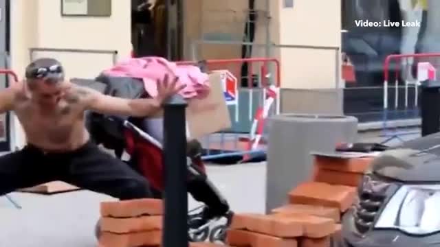 На кадрах видно, как уличный артист средних лет с голым торсом долго готовится к тому, чтобы ударить рукой по "башенке" из кирпичей, стоящей перед ним. Наконец он бьет по кирпичам локтем. Те падают вниз, абсолютно целые. Падает также и сам артист.