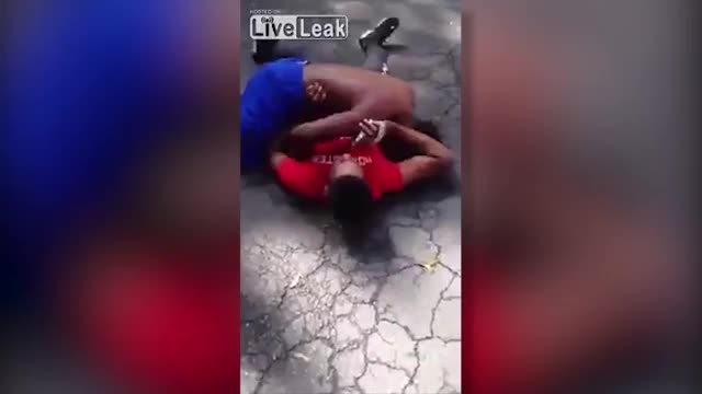 На кадрах ролика видно, как два молодых человека сцепились друг с другом. Они колотят друг друга, нанося удары без разбору.