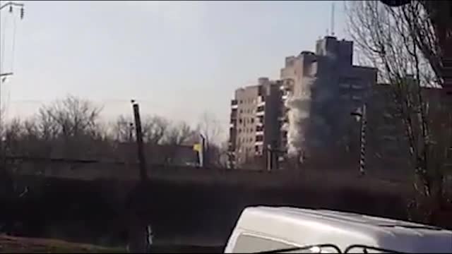 "Бьют по девятиэтажке, несколько попаданий было. Вот прямое попадание по дому", - говорит очевидец за кадром.