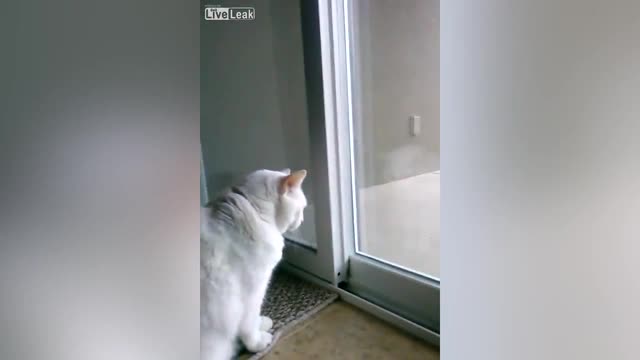 На кадрах можно увидеть, как белая кошка долго сидит и смотрит на пернатого врага, с которым ее разделяет стеклянная дверь. Животное шипит и "стрекочет", как будто подозревает ястреба в том, что он что-то замышляет. В конце концов кошка не выдерживает и пытается ударить птицу лапой, однако преграда мешает ей выяснить с ястребом отношения. Птица же, не догадываясь, что она в безопасности, отлетает в сторону. Тем не менее на этом битва "белой" и "темной" силы не заканчивается.