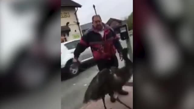 Удивленный очевидец называет хозяина птицы ненормальным и поражается увиденному. В ответ мужчина ругается и кричит, что на поводке у него эму, а вовсе не страус. Инцидент произошел в Британии, пишет "Лента.ру".
