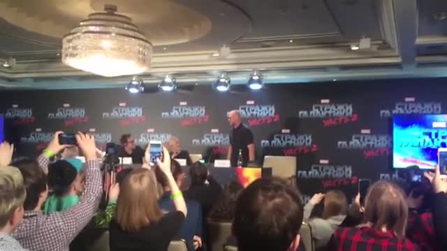 На пресс-конференции по фильму "Стражи Галактики" режиссер и сценарист фильма Джеймс Ганн вместе с исполнителем роли Йонду Майкл Рукер исполнили танец Грута.