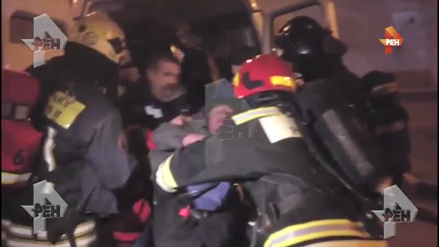 На кадрах сотрудники МЧС оказывают помощь мужчине, пострадавшему в квартире на 12-м этаже здания в Отрадном проезде.