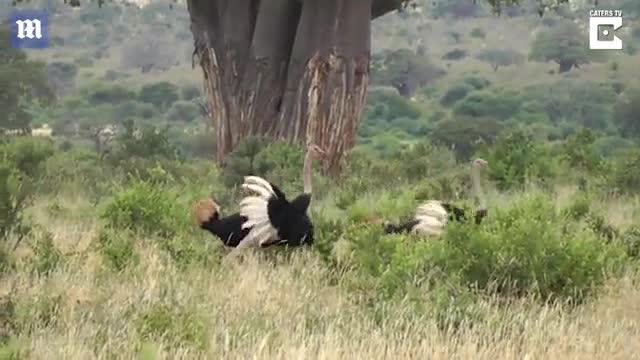 На кадрах можно увидеть, как два пернатых соперника толкают друг друга. Слон сначала наблюдает за ними, подняв голову. В какой-то момент он решает прекратить наблюдение и "разнять" дерущихся: слон эффектно бежит в сторону птиц, и страусы разбегаются.