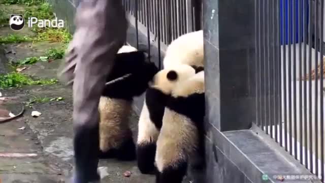 В Сети опубликовано видео, как четыре маленьких панды пытаются вырваться на свободу - они стремятся перелезть через открытые ворота, в которых стоит сотрудник зоопарка.