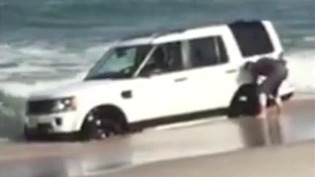 Как сообщают очевидцы, водитель хотел проехать на пляж, но, видимо, не рассчитал вес машины и сыпучесть песка и увяз. Он пытается освободить свой автомобиль, откапывая колеса, но океан все прибывает и не дает незадачливому водителю закончить начатое.