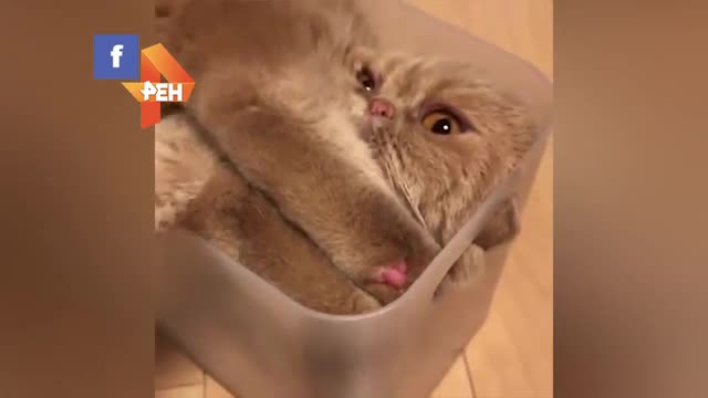 Питомец сидит в пластиковом контейнере вверх тормашками, а его лапы и хвост торчат снаружи.