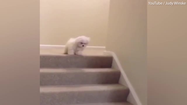 В Сети набирает популярность видео, в котором щенок мальтийской болонки столкнул другого щенка с лестницы и спокойно наблюдал за его падением.