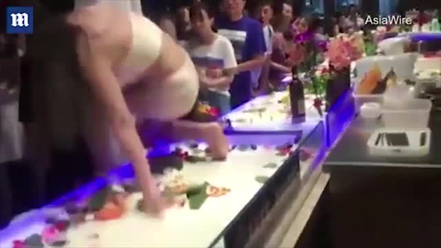 Полуобнаженная суши-герл, работавшая на одном из мероприятий, внезапно напала на посетителя, когда ей показалось, что молодой человек якобы пощупал ее, хотя на самом деле мужчина лишь слегка тронул девушку в области груди палочками для еды.