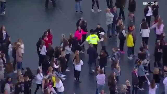 Полицейский в ярко-желтой рубашке прыгает и танцует с юными посетителями концерта в Манчестере, потом берет их за руки и начинает кружиться в хороводе.