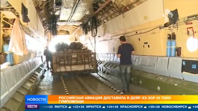 Российские пилоты сбрасывают гуманитарные грузы над городом. Так, российский центр по примирению самолетом Ил-76 доставил местным жителям 20 тонн гуманитарной помощи. Груз на парашютных платформах приземлился точно в свободной от боевиков зоне, чтобы экстремисты не смогли его захватить и лишить мирных жителей продуктов.