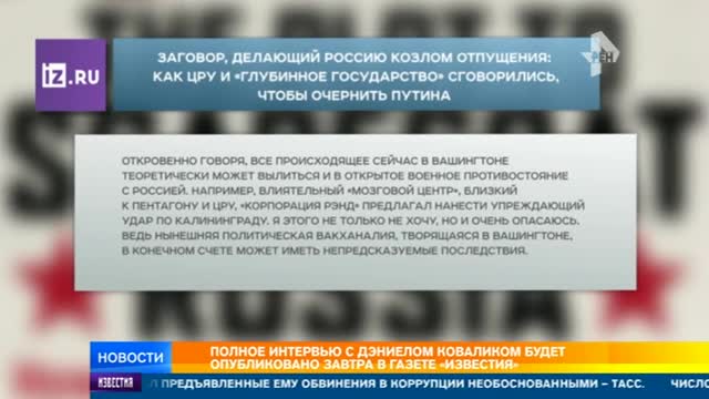 Информационная политика американских СМИ — результат заговора. Именно в этом убежден юрист, профессор университета Питсбурга Дэн Ковалик, который написал книгу под названием "Заговор, делающий Россию козлом отпущения: как ЦРУ и "глубинное государство" сговорились, чтобы очернить Путина". По данным автора, так называемое "Ястребиное крыло" будет стараться делать всё, чтобы сохранить свои позиции, а вот итог может оказаться страшным для всех.