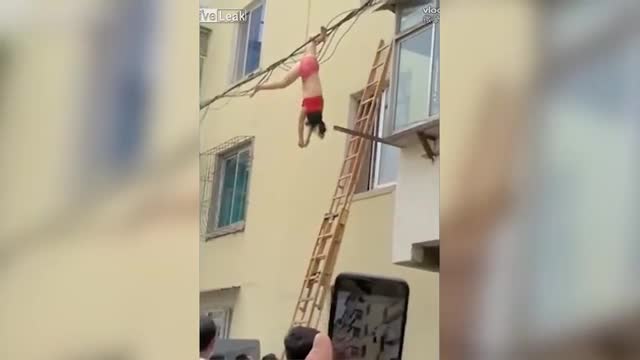 Выпавшая из окна полуголая китаянка чудом выжила, повиснув на проводах. Очевидцы сняли инцидент на видео.
