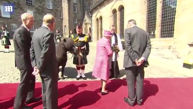 Заметив в руках Елизаветы II букет цветов, животное попыталось съесть цветы. Королева отчитала пони, спрятала от него букет, а затем погладила животное.