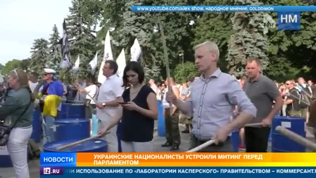 Так, на акции протеста вместе с боевиками из запрещенного в России батальона "Азов" и радикалами из партии "Свобода" был замечен Михаил Саакашвили. Одиозный политик практически не выпускал из рук микрофон, и переходя с украинского на русский и обратно, призывал толпу к революции. Впрочем, националистам было не до него — своих соратников они заводили игрой на железных бочках.
