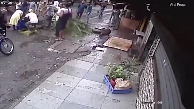 На них видно, как женщина идет по дороге, но неожиданно на нее падает пальмовое дерево.