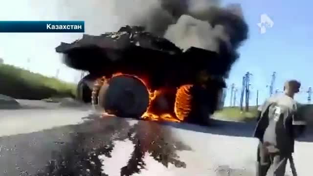В Казахстане очевидцы сняли на камеру самого безмятежного борца с огнем. Многотонный карьерный самосвал на кадрах, постепенно охватывает пламя. Огромные колеса уже превратились в яркий факел. Водитель "БелАЗа" не растерялся, остановил проезжающий грузовик, а пока его коллеги подключали к цистерне шланг, непринужденно докуривал сигарету, наблюдая за пожаром.