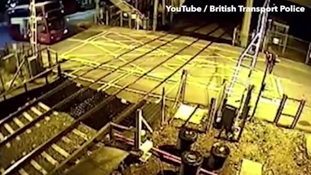 В Сети появилось видео, сделанное камерами внешнего наблюдения, на котором двухэтажный британский автобус на полной скорости сносит железнодорожные шлагбаумы, буквально пролетая над рельсами перед приближающимся поездом. Сообщается, что инцидент произошел 29 мая этого года в Тоттенхеме.