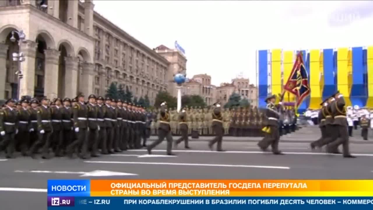 Пешком проходит колонна украинских танкистов. На параде в честь Дня независимости ни одного танка или вертолета. А как иначе? Если на вооружении большинство техники советского времени. Показать ее для лидера независимой Украины — значит противоречить себе же, ведь, по словам Петра Порошенко, его страна давно избавилась от всего советского и русского, всего, что давно мешало Киеву дышать полной грудью. "Дорога одна: широкий евроатлантический автобан, ведущий в НАТО и к членству в ЕС. Соглашение об ассоциации и безвиз – это окончательный разрыв с империей зла", — заявил Порошенко.
