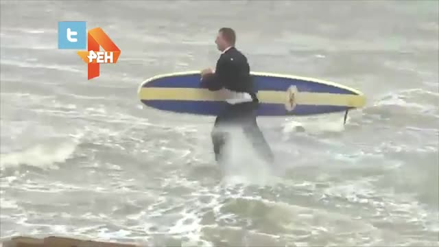 Видео: Американец во фраке занимается серфингом во время урагана "Харви"