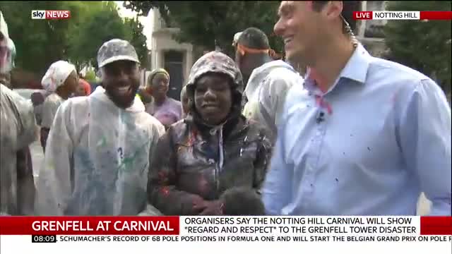 Ведущего британского телеканала Sky News Джо Тайди "обстреляли" сухими красками в прямом эфире во время репортажа с карнавала в Лондоне.