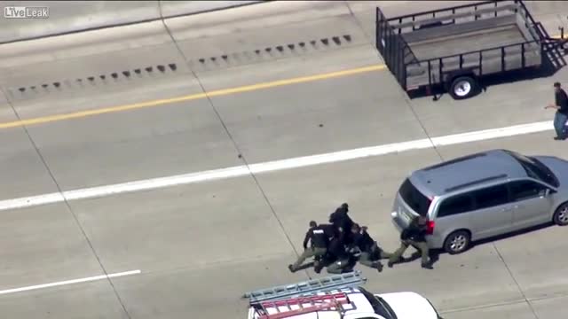 На кадрах видео видно, что преступник пытается скрыться от правоохранителей, перебежав скоростное шоссе. В какой-то момент он едва не попадает под машину, однако умудряется запрыгнуть ей на крышу. Его окружают полицейские, а один из них с ходу запрыгивает на автомобиль и сбивает преступника на асфальт.