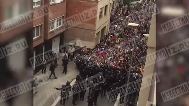 Сторонники референдума в Каталонии пытаются со стрельбой прорваться к участкам для голосования через оцепление полиции. Как видно на записи, под напором толпы правоохранители вынуждены отступать.