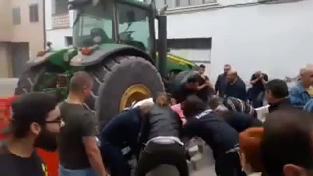 На кадрах записи видно, как жители автономии сдвигают блоки около трактора. Отмечается, что при возведении других баррикад использовались строительные смеси.