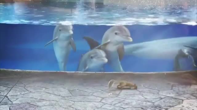 На этих кадрах можно увидеть, как четыре дельфина в вольере с интересом наблюдают за двумя белками из-за стекла и почти одновременно поворачивают головы в их стороны.