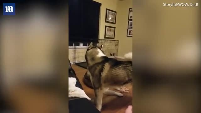 На этих кадрах можно увидеть, как пес воет в ответ на реплики мужчины. Как пишет Daily Mail, таким образом пушистый питомец просил вывести его на улицу.