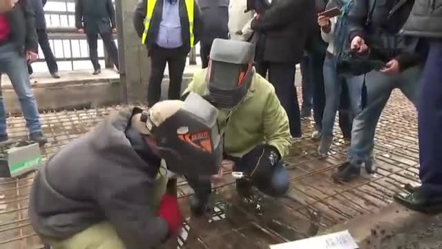 Перед камерами журналистов украинский премьер облачился в костюм сварщика и решил принять участие в строительстве моста через Днепр. "Человек из народа" заявил, что в юности работал на заводе и сможет сварит один из швов конструкции.