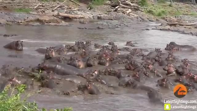 На кадрах видно, как опасная рептилия пытается вырваться на свободу. Окруженный не менее 30 бегемотами крокодил отчаянно борется за выживание.