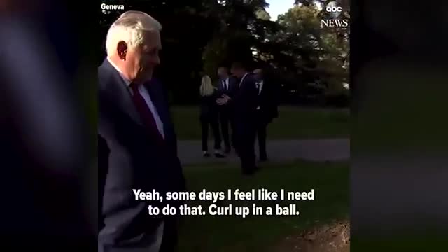 "Бывают дни, когда мне необходимо это сделать. Свернуться калачиком", — сказал Тиллерсон, осматривая в Женеве скульптуру двух людей, обхвативших колени.