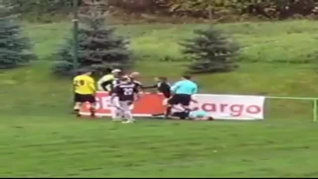 В Сети появилось видео инцидента, произошедшего на 36-й минуте матча, в котором команда известного в России футболиста встречалась с клубом "Высоке Мито". Разъяренный защитник повалил арбитра на землю и стал избивать его ногами после стычки с игроком команды соперника.