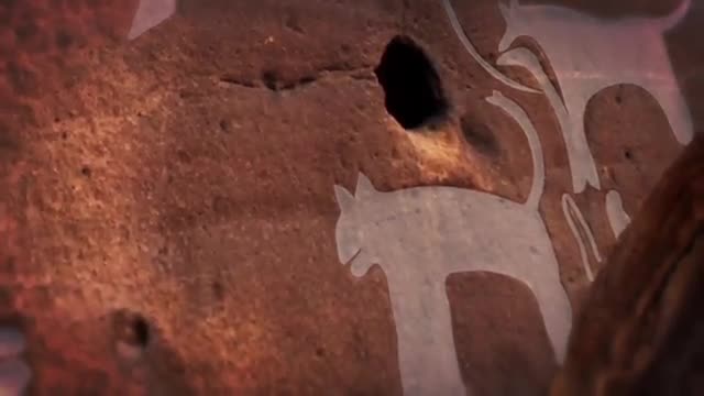На рисунке изображен охотник с луком в окружении 13 собак. На двух из них надето нечто, что можно расценить как поводок. По мнению сотрудников Национального музея естествознания Смитсоновского института США, данный материал может свидетельствовать о том, как рано стали использовать люди собак для охоты.