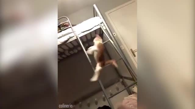 В Сети набирает популярность видео, на котором кот попытался спуститься с двухэтажной кровати по лестнице, но прыжок оказался для питомца слишком экстремальным. Прежде чем оказаться на полу, кот, сам того не ожидая, проделал сальто несколько раз. Четвероногого акробата засняла на видео и показала в соцсетях его хозяйка.
