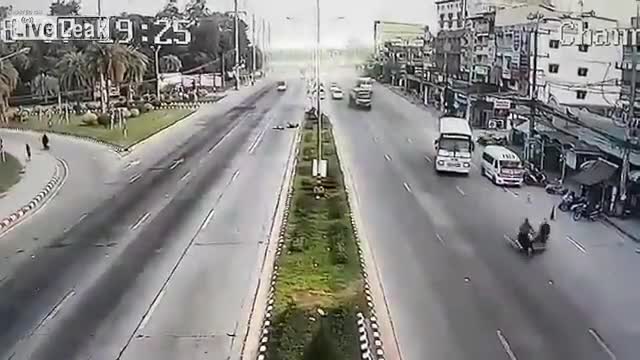 На кадрах видно, как грузовик едет на полной скорости, но неожиданно у него слетает одно из колес. Покрышка перелетает полосу безопасности и падает прямо на мотоциклиста, который следовал в другом направлении.
