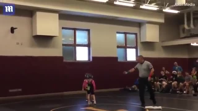 Видео: малыш сорвал поединок по реслингу, решив, что драка настоящая и пора вступиться за сестру