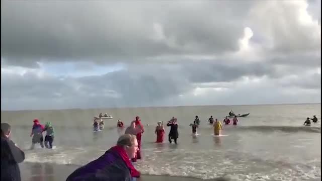 Великобритания провела традиционный рождественский заплыв. На то, как участники, облаченные в костюмы Санта-Клаусов, суперменов и персонажей мультфильмов, окунались в Ла-Манш, пришли посмотреть тысячи зрителей. Оказалось, что пролив им переплывать вовсе необязательно - им было достаточно окунуться в воду.