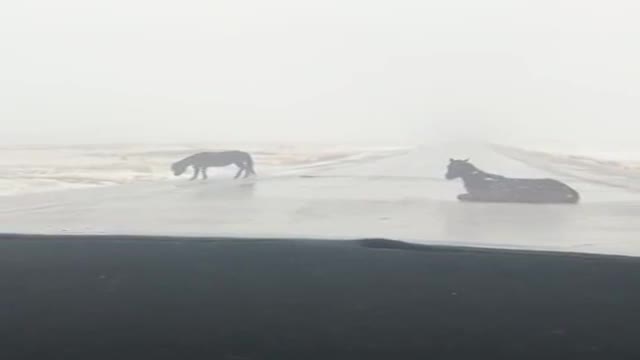 В Сети опубликовано видео с лошадьми, падающими на скользкой трассе в Казахстане.
