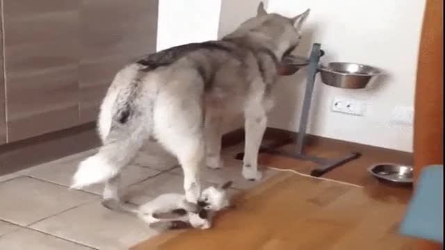 На этих кадрах можно увидеть, как кошка, вцепившись в лапу пса, кусает его и отчаянно бьет лапами. Судя по всему, это уже не первая попытка усатого питомца помешать приему пищи более крупного товарища – миски собаки стоят на приступочках, благодаря чему они недоступны для кошки.
