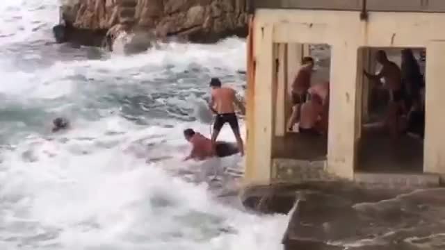 Только вот выбраться пожилым людям оказалось проблематично. Огромные волны бросали людей на бетонные плиты пирса.