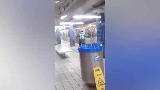 Видео: в США фанат футбольной команды от избытка чувств едва не упал под поезд метро