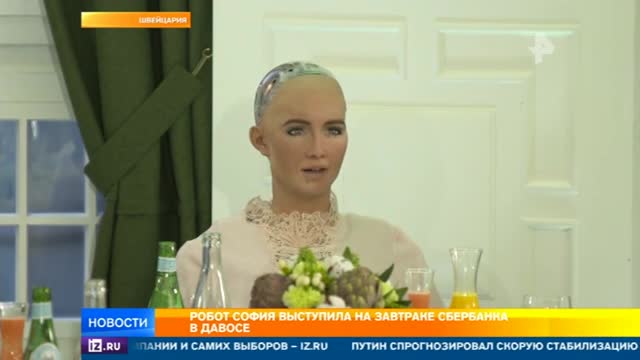 Человекоподобный робот София пообщалась с участниками Всемирного экономического форума в Давосе. В рамках беседы с главой Сбербанка Германом Грефом андроид предложила снимать меньше фильмов, которые представляют роботов в негативном свете.