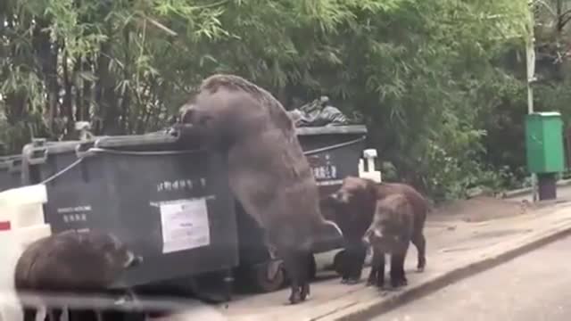 Вепрь, как видно на ролике, выложенном на "Ютубе", увлеченно рылся в мусорном контейнере и не обращал внимания ни на людей, ни на своих сородичей поменьше. Пол дикой свиньи доподлинно неизвестен, но, как сообщает издание Mirror, размеры животного могут указывать на то, что это самец.