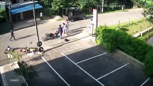 15 февраля в городе Моравака на Шри-Ланке произошло столкновение двух мотоциклистов. Шокирующий инцидент попал в поле зрение камеры видеонаблюдения.