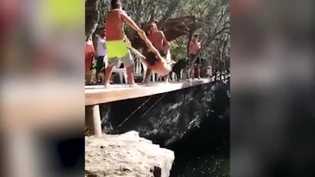 На этих кадрах можно увидеть, как они, стоя на мосте, держат друга за руки и за ноги и раскачивают. С ними рядом находятся другие люди, а также несколько собак. В какой-то момент, раскачивая друга, они случайно ударяют его телом о собаку. Та отлетает в сторону и падает с моста.