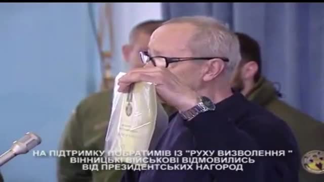 В ходе мероприятия один из них подошел к микрофону и заявил, что после того, как его "побратимов" избили у здания Верховной рады, он не хочет владеть медалью, которую получил от президента.