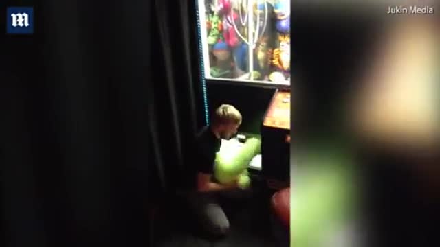 Дети просто пытались вытащить мягкую игрушку, но вместо какого-нибудь плюшевого мишки "когти" автомата вытащили молодого человека, который неизвестно за чем прятался в автомате.